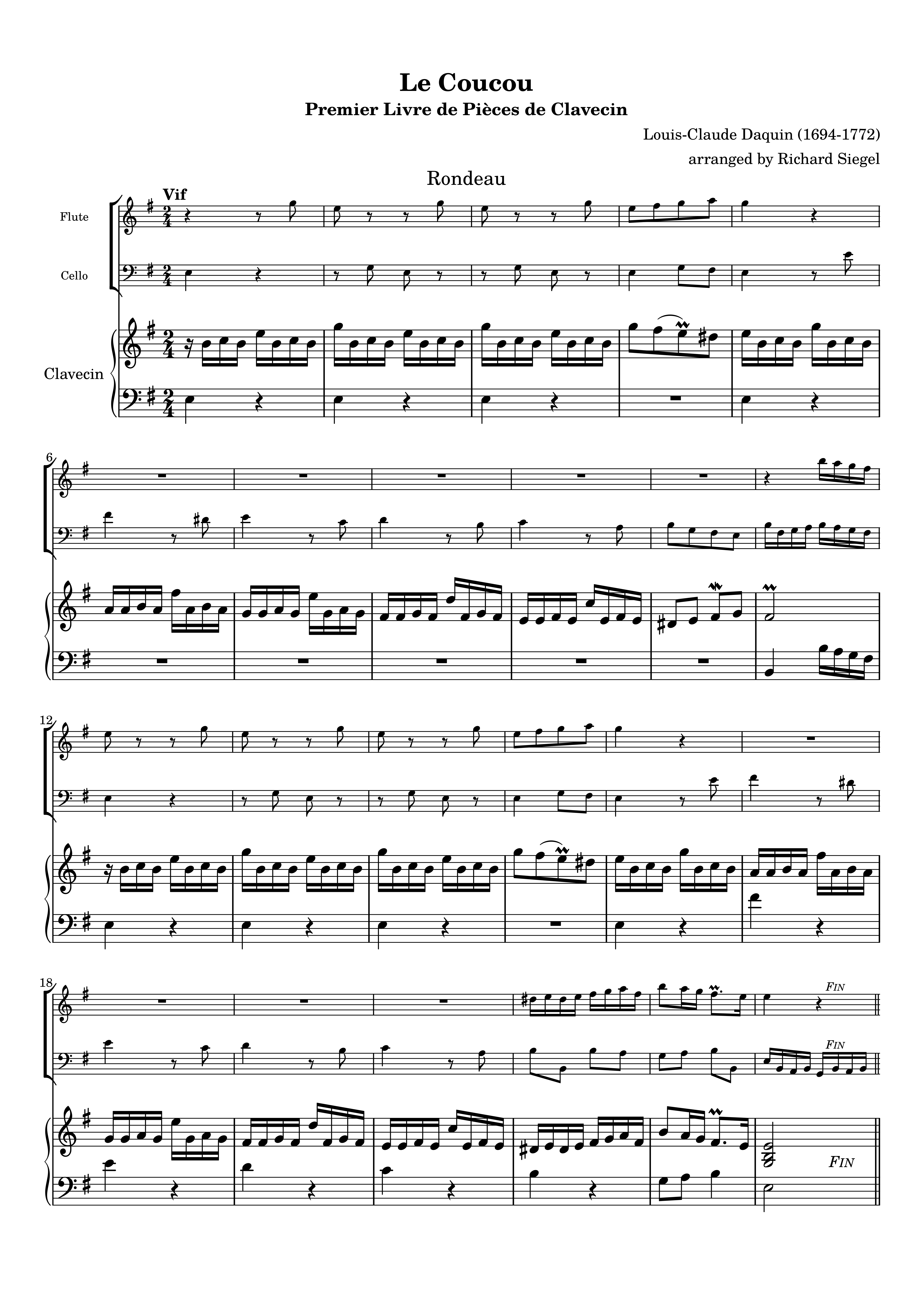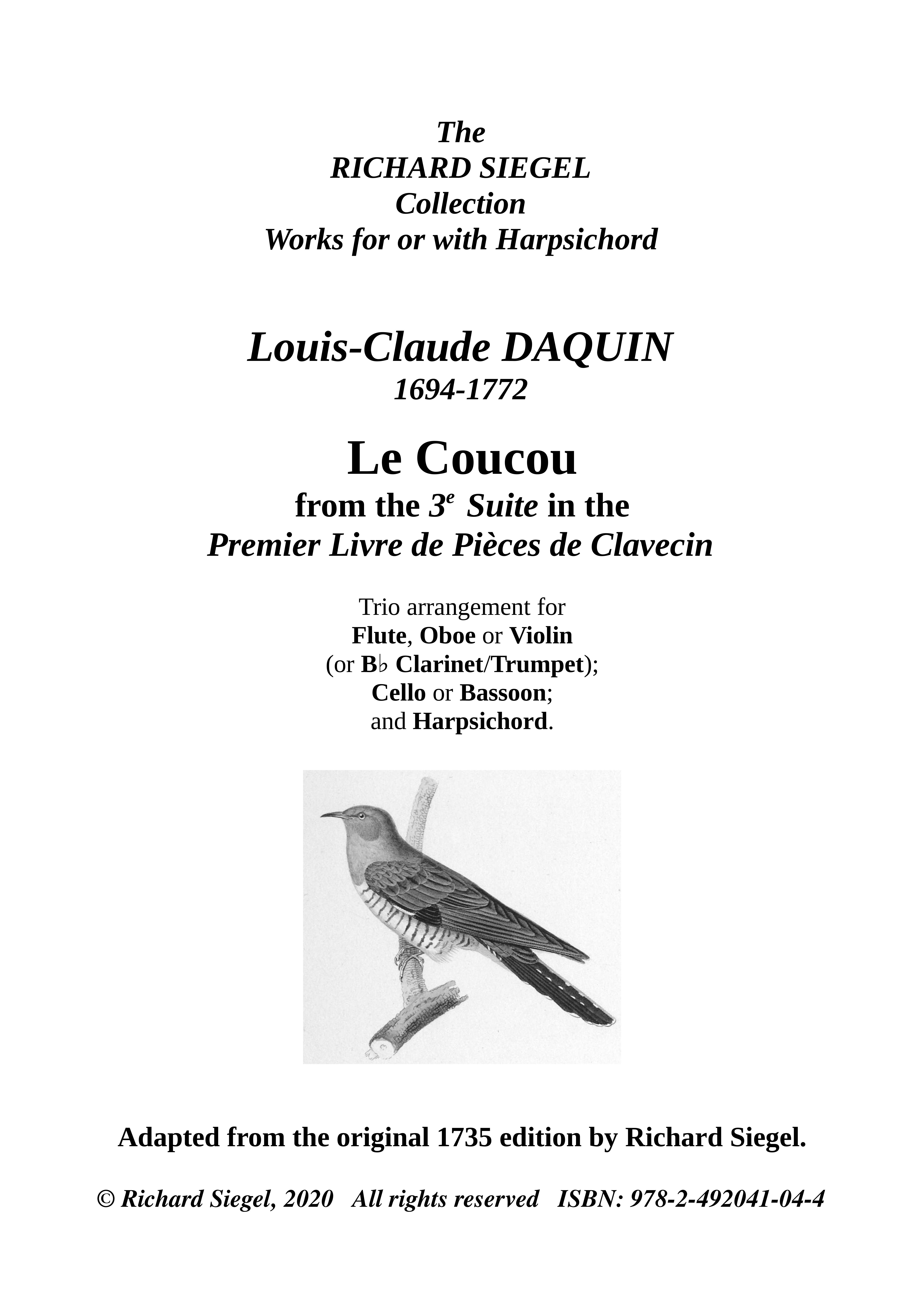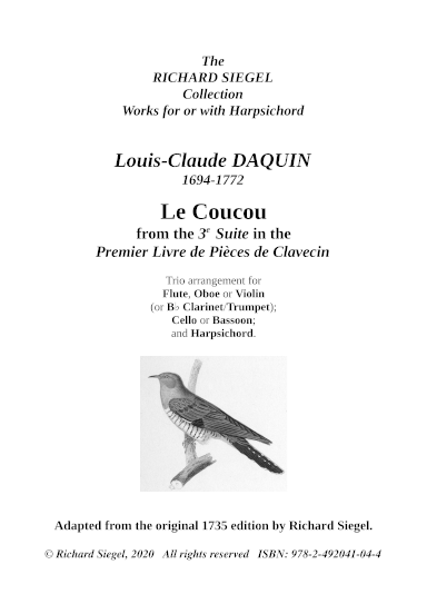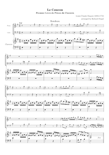 Undoubtedly Daquin’s most popular work, this arrangement of the Coucou is fun to play, and easy enough for young instrumentalists. As you can see, it can be played by several different melodic instruments, and different bass instruments as well.
