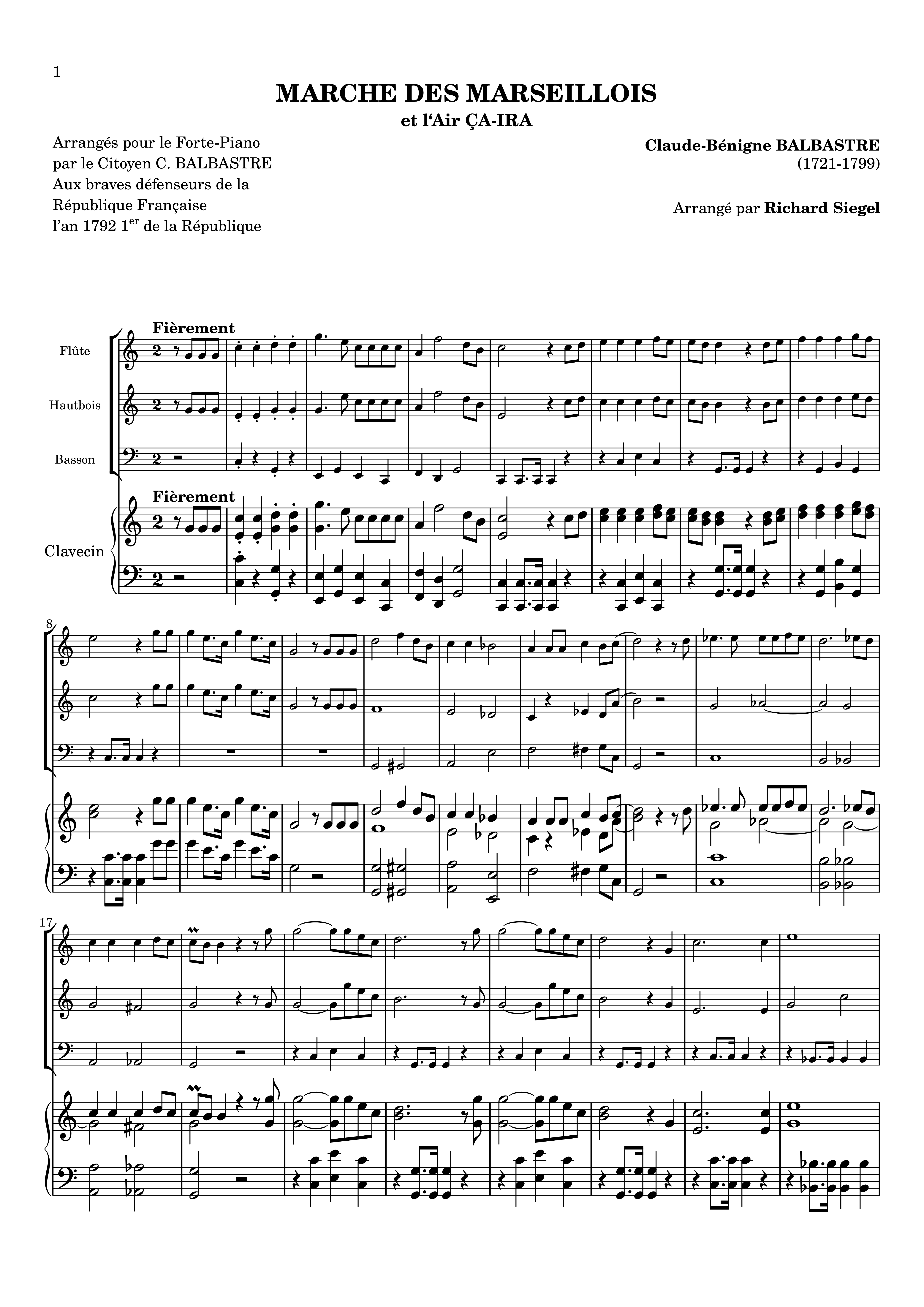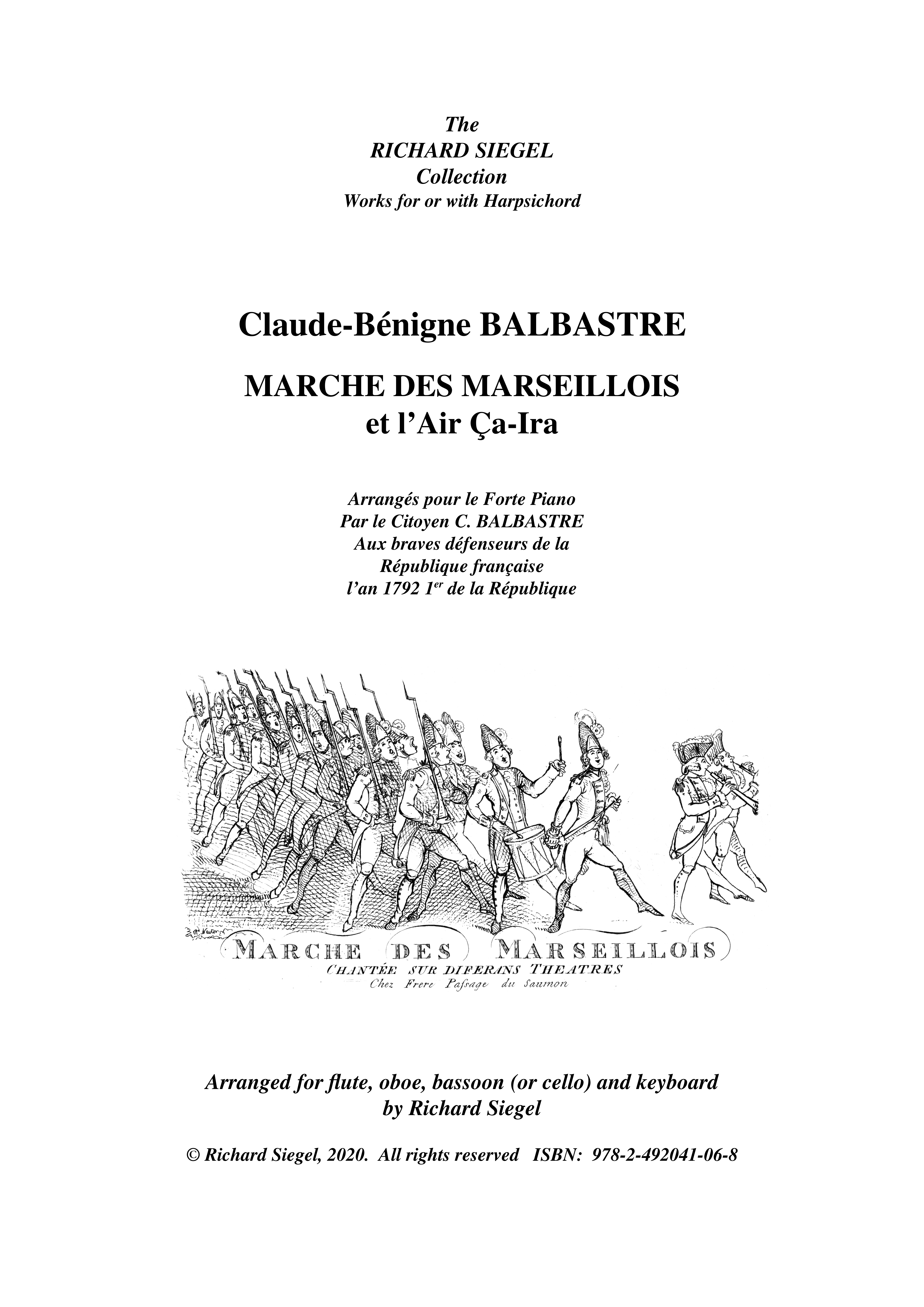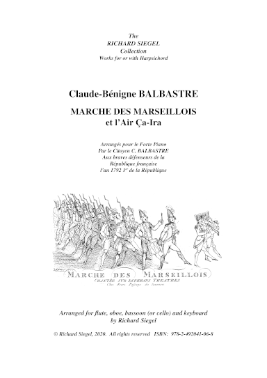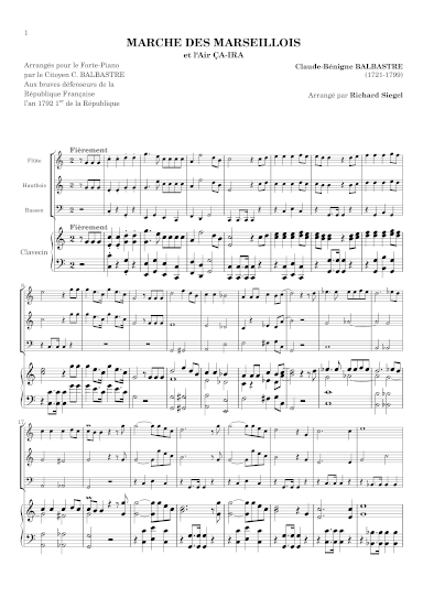"Sieur" Balbastre became "Citoyen" Balbastre after the French Revolution in 1789. One of the most popular musicians and organists of his time, he then composed variations on the "Marseillaise et Air ça ira", for solo harpsichord. Although not the most serious of works, this arrangement for young chamber music adepts is fun to play.