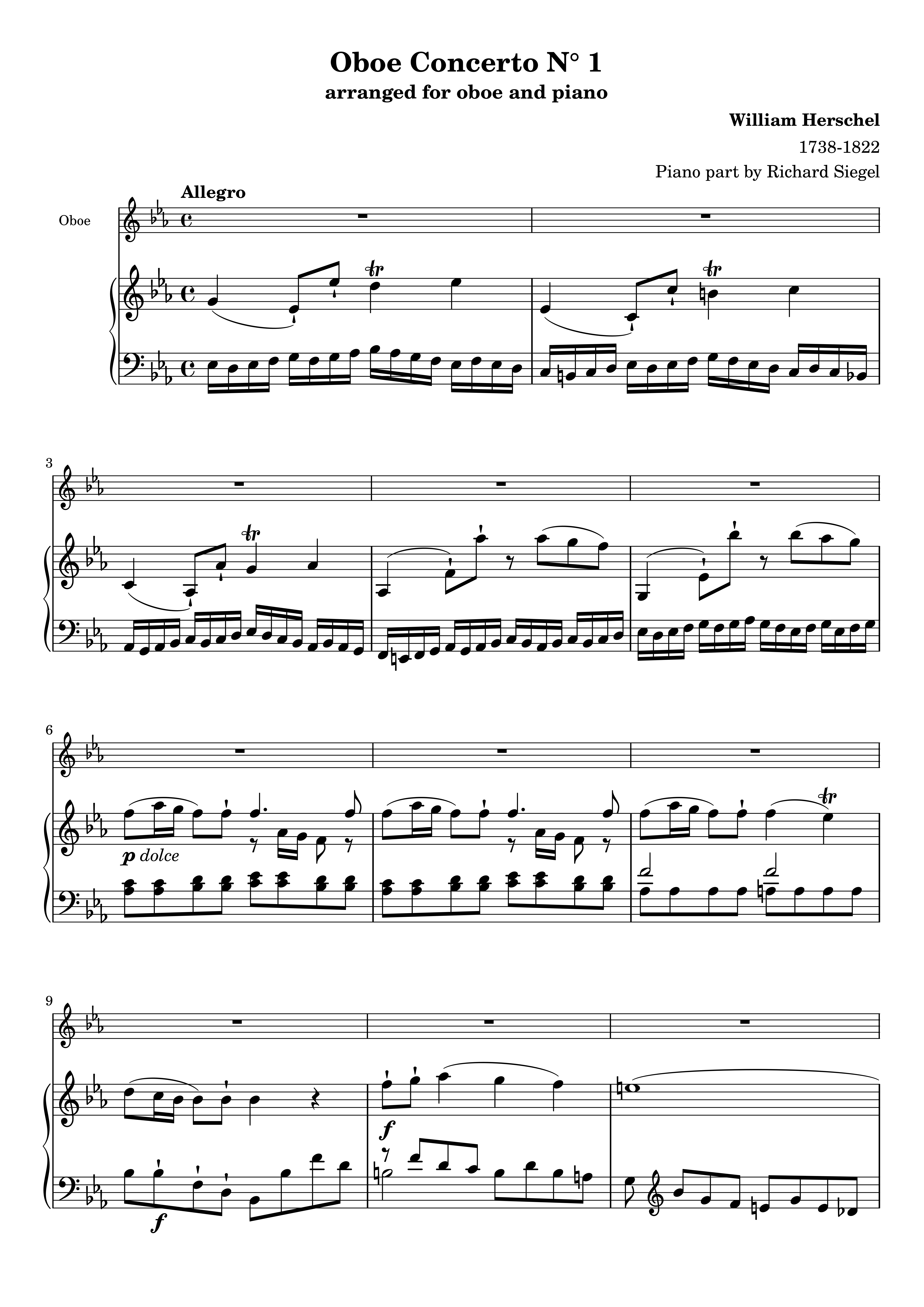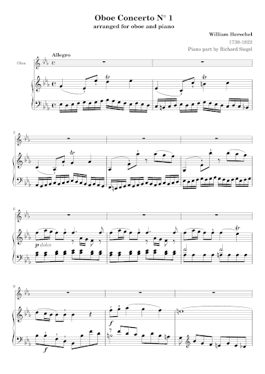 Of the three oboe concertos that William Herschel wrote, this one is the most interesting and best constructed. The keyboard accompaniment is a good reflection of his orchestral writing. The cadenza was composed by Valentin Villenave, and provides a good foil to the 18th century style. Obviously oboists can write or improvise their own cadenzas.